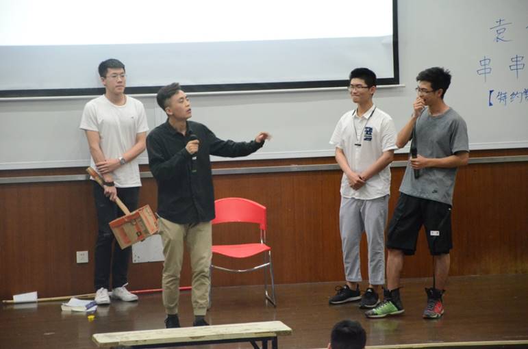 晚19时整,即兴话剧大赛正式开始。赛前,各班编写剧本,自主排练;活动中,主办方挑选现场学生作为临时演员参考剧本即兴发挥,与各班演员共同完成表演。各班选取的话剧题材广泛,内容贴近生活而又思想深刻:有对洛阳纸贵的故事新编,阐述创新发展之道;有对经典电影的改编重演,在嫁接现代元素的背景上描绘凄美爱情故事;有对当今社会网络问题的演绎,探讨现代社会的亲情联系……临时演员即兴生发的奇思妙语也令观众捧腹大笑。表演结束后,同学们上台倾情献唱,声振林木,将大赛推向了高潮。