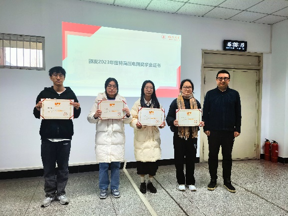 2023年度特高压电网奖学金表彰决定,并代表学院向张颢严等10位荣获本年度特高压电网奖学金的优秀学生表示祝贺。
