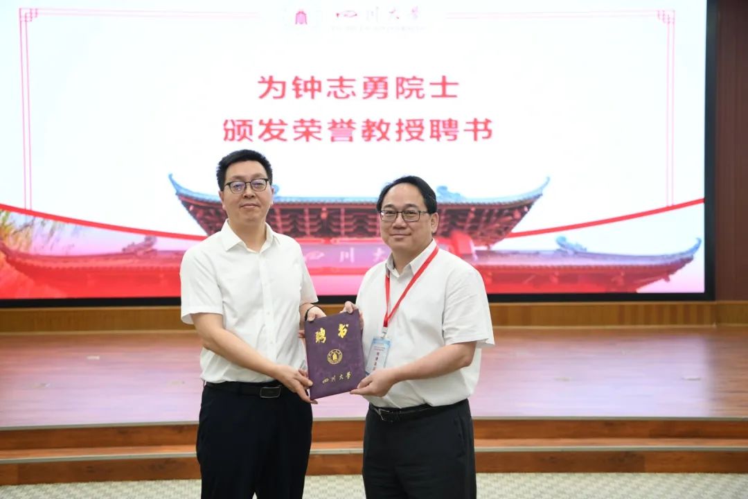 在受聘仪式上,赵昱辉介绍了钟志勇教授的学术经历和主要贡献,以及他在电力系统稳定性、智能电网等领域的杰出成就。刘超副校长为钟志勇颁发了a漫