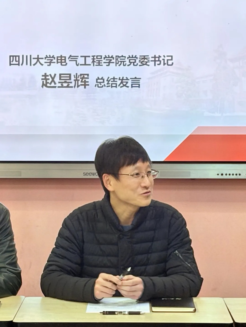 赵昱辉书记代表学院祝贺获奖同学,并关切了解同学们的职业规划。他说,特高压电网奖学金体现了国家电网对能源领域人才培养的高度重视,这份荣誉既是对同学们既往拼搏的肯定,更是对未来勇攀高峰的期许。同学们要立足国家“双碳”战略需求,在特高压技术攻关中锤炼硬核实力,传承学院“海纳百川、大器天下”的精神,将个人理想融入行业发展,成为兼具家国情怀与卓越创新能力的行业领军人才。