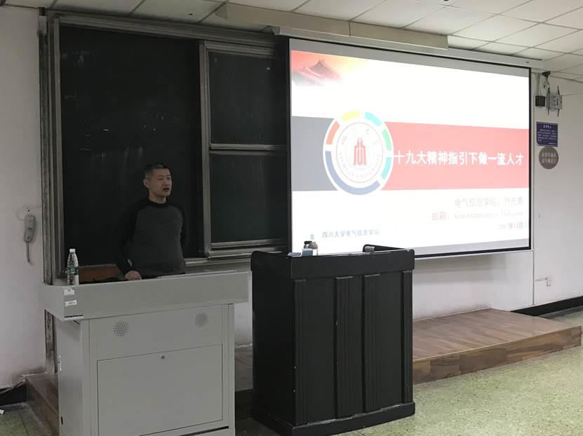 2017年12月15日晚,电气信息学院院长肖先勇教授走进2015级本科生的形势与政策教育课课堂,为同学们上了一节以“十九大精神指引下做一流人才”为主题的思想政治理论课。旨在学习贯彻十九大精神,号召大学生争做当代一流人才。a漫