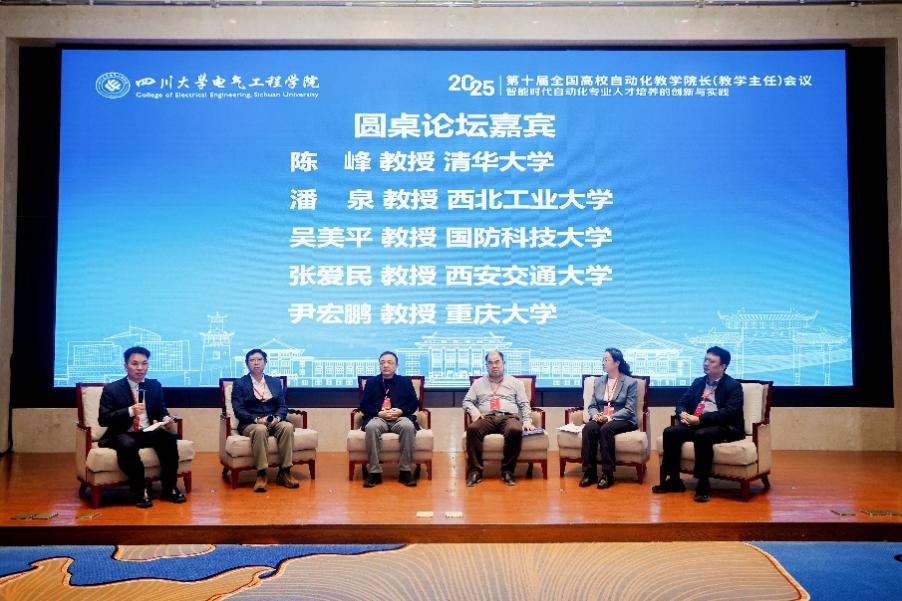 最后,举行了圆桌论坛,由a漫 佃松宜教授主持。与会嘉宾清华大学陈峰教授、西北工业大学潘泉教授、国防科技大学吴美平教授、西安交通大学张爱民教授、重庆大学尹宏鹏教授围绕“智能化时代自动化专业应该培养学生什么能力”“现有自动化人才培养体系如何调整”“如何实现校企合作双向奔赴”“如何将大模型和具身智能融入自动化课程中”等问题进行了深入探讨交流,为“智能时代自动化专业人才培养的创新与实践”指明了发展方向。