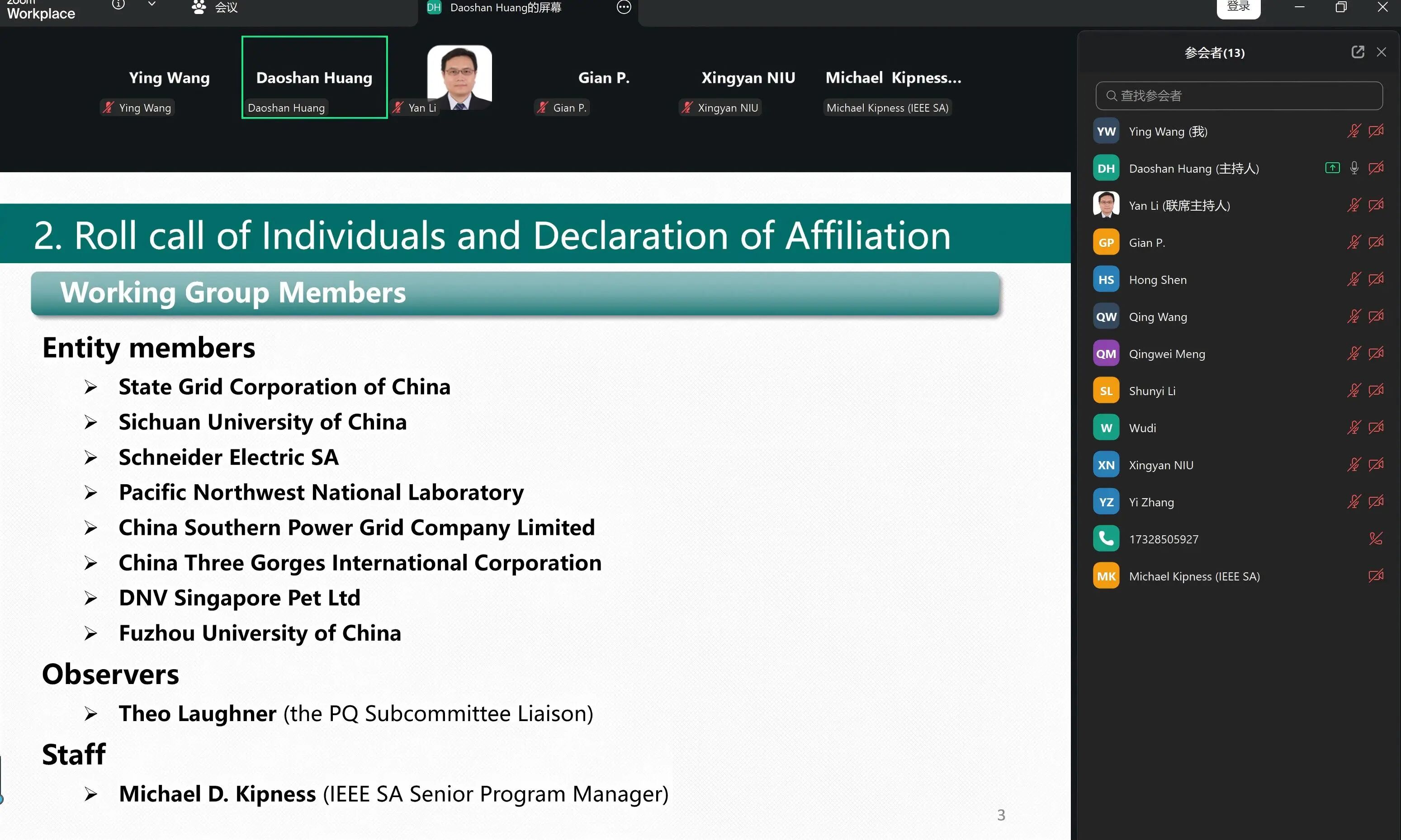 、施耐德电气公司、太平洋西北国家实验室、南方电网、中国三峡国际股份有限公司、挪威船级社(DNV)新加坡公司、福州大学等相关高校、科研院所及企业的专家代表共13人线上线下参会,对标准草案的具体内容、分工等进行了讨论。