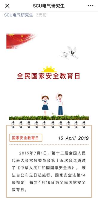 还利用各类自媒体平台,如微信公众号等,向学生们推送维护国家安全的相关知识,进行广泛、有效地宣传。