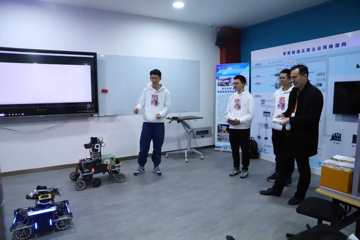 研一的王红莉同学向代表团讲解了可通过控制六个旋转关节灵活运动的机械臂;本科大四的邓孝云同学向代表团展示了“机甲战队”的机械战车装置,其精巧的设计,灵活的转向漂移,以及良好的团队配合,受到了代表们的一致好评,更有代表发出感叹:“这是祖国的未来。”