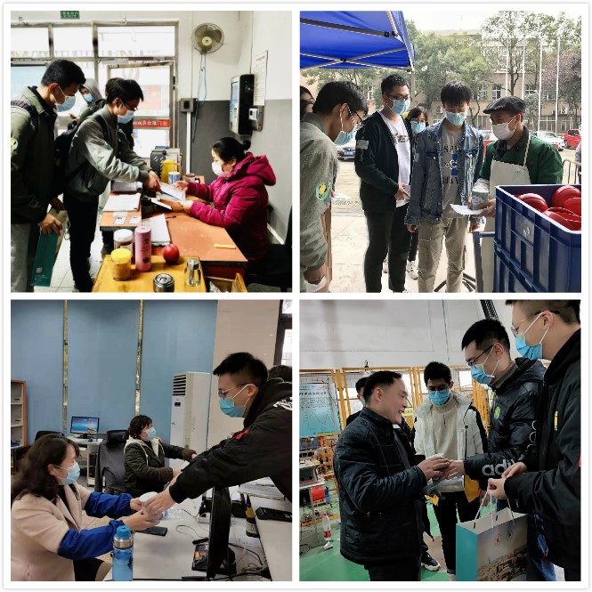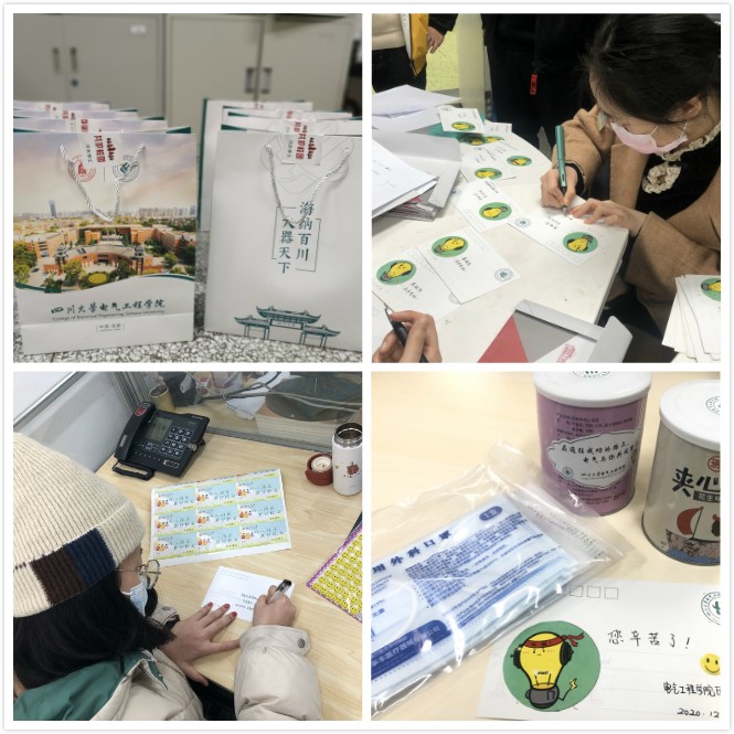 学生党员代表以及团委学生会、研究生会、班团支部学生干部分别在望江、江安校区为学生宿舍管理员、教学楼和高压楼保安、中心食堂及工学图书馆管理人员送上了口罩、食品和爱心卡片,并代表学院全体学生向后勤服务人员表达了最诚挚的问候与感谢。