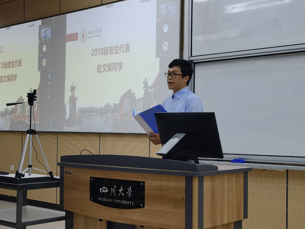 学院2018级电气工程及其自动化专业本科生赵文焕代表老生进行发言。赵文焕同学以“适应”“选择”“积累”三个关键词出发,讲述了高中与大学的不同,鼓励学弟学妹们积极寻找自身长处发挥优势;他以自身经历提醒大家要做出锚定理想的选择,不要执着于事事都求圆满,并以自己曾在双创中心经历的科研训练来鼓励大家多多积累专业知识。