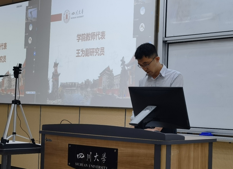 王为老师作为学院教师代表发言。王老师首先对新生们过去的努力与成就表示了肯定与赞扬,并就如何度过本科四年给出了自己的几点建议。第一点建议是树立正确目标,他认为爱国是人才培养的第一要求,希望同学们感恩祖国、将自身命运与时代发展紧紧相连。第二点建议是坚持积极的学习态度,希望同学们不要畏惧学习困难,脚踏实地,努力奋进。第三点建议是希望同学们打好专业基础,培养好英语能力,王老师着重强调了关于数理知识的掌握,并以自身求学科研经历为例,证明了专业基础课对同学们后续职业发展的深刻影响。第四点建议是培养想象力,王老师认为在拥有了全面的专业知识后,丰富的想象力能够为科学研究带来新的可能。