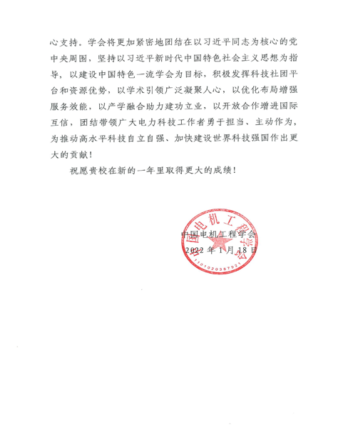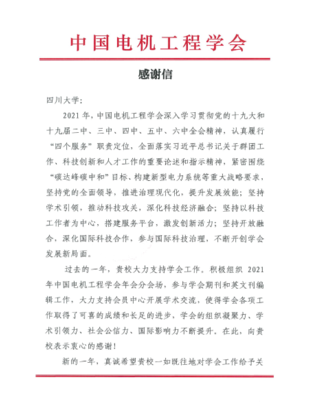 2022年1月18日,中国电机工程学会发来感谢信,对a漫