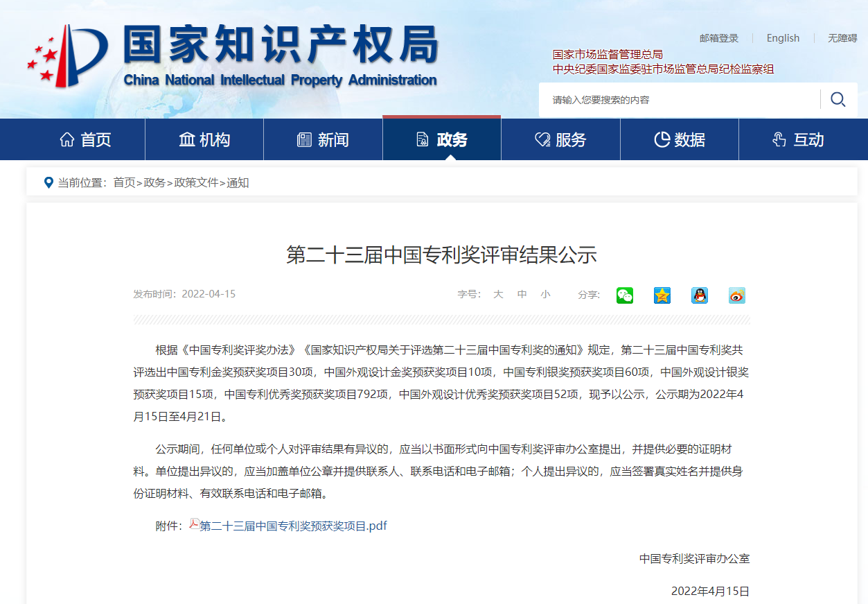 2022年4月15日,国家知识产权局公示了中国专利奖评审结果,a漫
