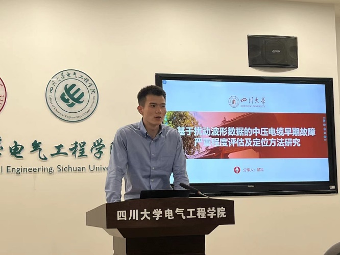 交流环节,19级硕士毕业生李卓城作主题为“分布式电源接入背景下的配电网谐波评估与治理方法研究”学术分享,重点围绕“不完全测量条件下的中压配电网谐波评估方法”、“基于储能系统优化调度的中压配电网谐波治理方法”和“基于虚拟谐波阻抗控制的低压微电网谐波治理方法”三个方面展开,并详细介绍了科技论文的撰写方法。19级硕士毕业生瞿科围绕“基于扰动波形数据的中压电缆早期故障严重程度评估及定位方法研究”主题分享了“电缆早期故障动态模型”、“电缆早期故障波形特征分析”和“电缆早期故障严重程度评估方法”三个方面内容,并表示要将科学理论研究与实际电力工程有机结合,两者互相促进、共同发展。