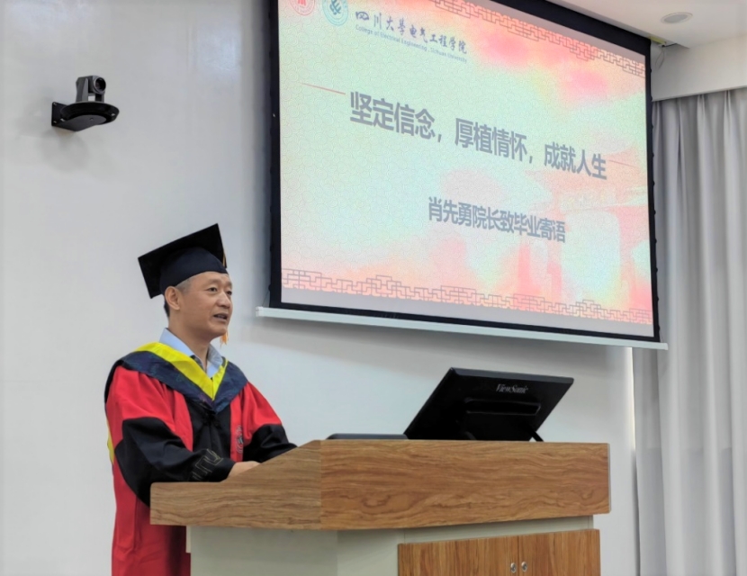 院长肖先勇教授为所有毕业生送上题为《坚定信念,厚植情怀,成就人生》的毕业寄语。肖院长对同学们提出三点希望:一是坚定信念,心中有梦。希望同学们坚定理想信念,始终心中有梦,将个人理想与祖国前途、民族命运紧密联系起来相连,在建设伟大祖国中成就更加优秀的自己。二是守正奉献,眼里有光。肖院长鼓励同学们把所学专业知识和所培养的创新能力,更多用于服务国家需要,服务社会,服务地方经济。三是砥砺奋进,大器天下。肖院长勉励同学们继续保持砥砺奋进,大器天下的底色,永远“做想不优秀都不可能”的川大电气人。希望大家永葆川大气质,永葆川大电气本色,把川大精神、电气气质发扬光大,并通过同学们在未来的人生道路中把川大精神、川大气质用于服务国家、奉献时代。最后,肖院长表示a漫