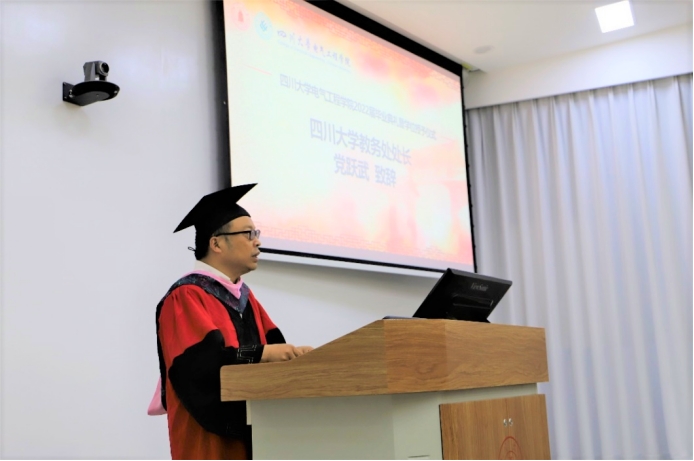 党委书记韩芳、院长肖先勇、党委副书记戴婷婷、副院长周步祥、副院长李成鑫、电气工程系主任王渝红、自动化系主任佃松宜、电工电子基础实验教学中心主任周群、电气工程系党支部副书记刘亚梅以及2022届毕业生代表参加了毕业典礼。典礼由党委副书记戴婷婷主持。