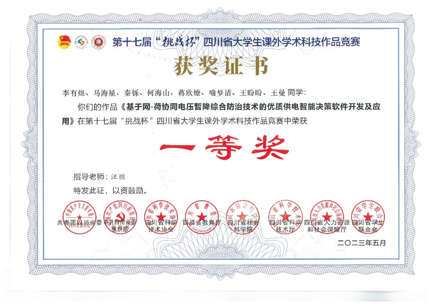 获奖项目《基于网-荷协同电压暂降综合防治技术的优质供电智能决策软件开发及应用》,指导老师为汪颖教授,团队负责人为李有煜,团队成员包括:马海星、秦烁、何海山、蒋欣燎、喻梦洁、王盼盼和王曼同学。获奖团队依托电能质量与电磁环境学省级重点实验室,致力于解决困扰敏感用户的电压暂降问题,构建网-荷协同的电压暂降综合防治技术体系,开发了优质供电智能决策软件,在国内多个省市得到广泛应用。