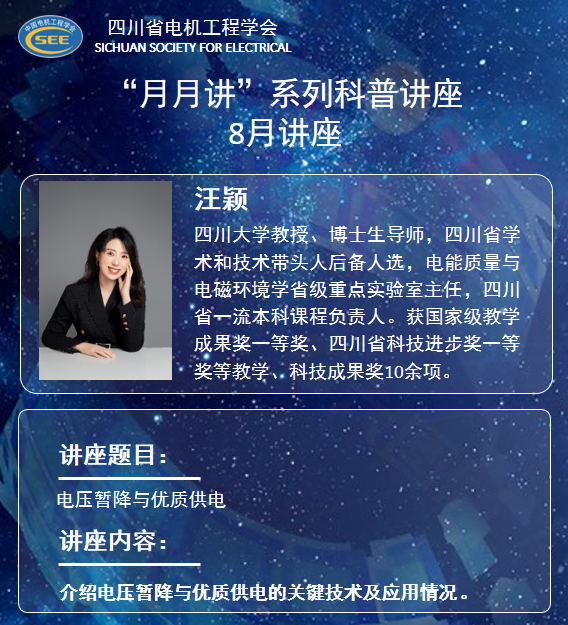 汪颖教授受邀参加四川省电机工程学会主办的“走近电力”月月讲线上活动,并作题为“电压暂降与优质供电”的科普讲座。各高校及电网等企业的科技工作者共400余人观看了本次讲座。