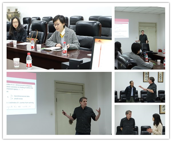 交流会上,韩芳书记首先代表学院对Fowler教授的来访表示欢迎,并从办学历史、院系结构、师资力量、人才培养、科研成果、国际合作等方面向Fowler教授介绍了学院的基本情况。接下来,Fowler教授以“Low-Rank and Sparse Representations in Signal Processing”为题,向参会老师开展了学术报告。报告中,Fowler教授介绍了信号处理领域中常用的低秩和稀疏表达方法。他首先介绍了传统的降维特征提取方法——主成分分析(PCA)及其对噪声和离群点的鲁棒性不足的缺点。针对该问题,重点介绍了鲁棒PCA(RPCA)方法的原理。随后,他分别介绍了低秩和稀疏表达在三个方向的应用:1)视频前景及背景提取问题,着重介绍了RPCA、DECOLOR和MR-DECOLOR几种算法的原理及性能;2)高光谱图像中条状伪影去除问题,着重介绍了小波域的低秩\组稀疏方法(WDLRGS);3)聚类及非监督分类问题,着重介绍了基于低秩子空间表达的LRSR、LRSC、G-LRSC及SPHG-LRSC方法。