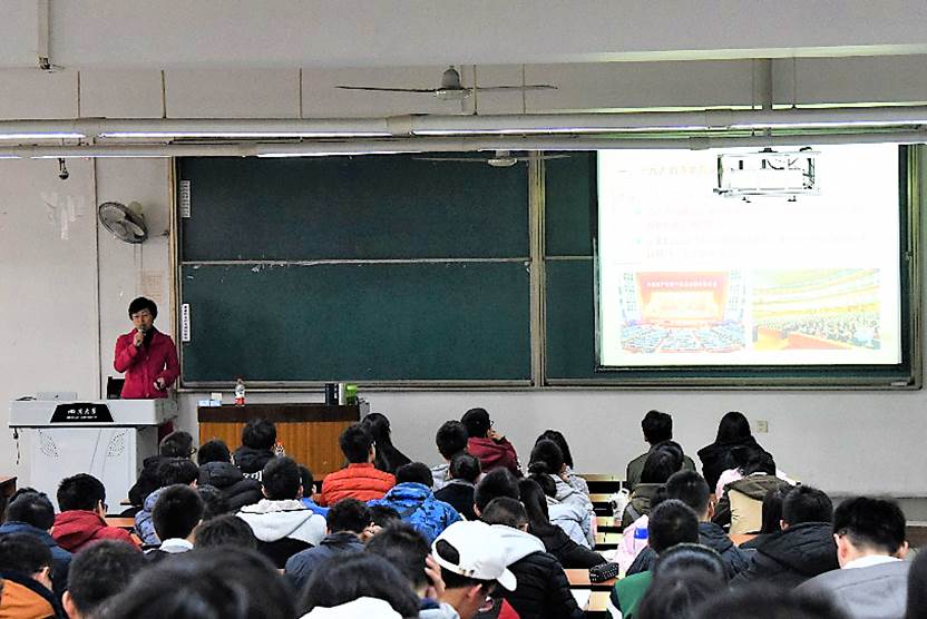 2017年12月1日下午,电气信息学院党委书记韩芳副教授走进了电气工程及其自动化专业2017级本科生的形势与政策教育课课堂,向同学们上了一节以“学习贯彻十九大精神,争做新时代有为青年”为主题的思想政治理论课。a漫