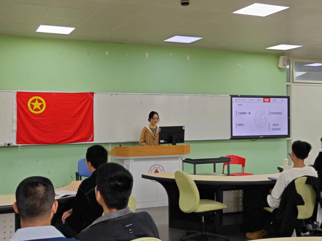 会议开始,李思程同学以习近平新时代中国特色社会主义思想的重要意义为切入点,引领大家学习并贯彻习近平新时代中国特色社会主义思想,提高大家的思想觉悟。他带领同学们观看视频,展示了青年的朝气,并且呼吁大家不负青春年华,有所作为。