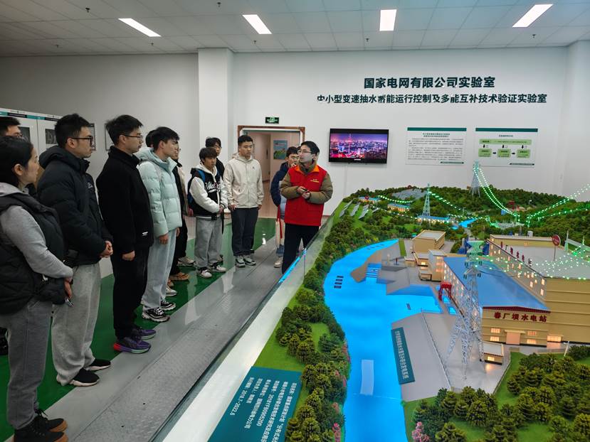 随后,大家前往变速抽水蓄能展厅。依托“中小型变速抽水蓄能运行控制及多能互补技术验证”实验室,同学们通过沙盘模型和图文介绍,深入了解抽水蓄能、水光储多能互补等技术应用场景,深度聚焦全功率变速抽水蓄能机组、梯级水光蓄互补系统等运行控制难题。