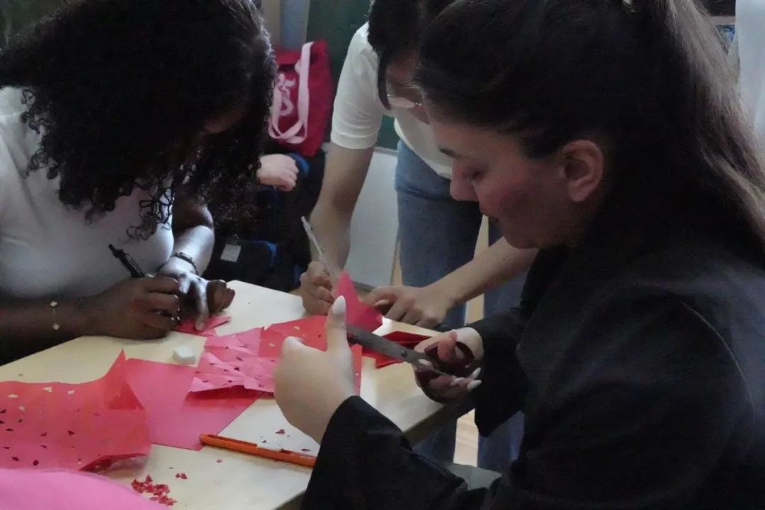 “咔嚓、咔嚓……”活动室里,电气学子化身文化讲解员,手把手带着德国伙伴折叠红纸。从对称的字到灵动的牡丹纹样,剪刀在指尖流转出奇妙弧度。当留学生们捧着自己剪出的镂空图案惊喜赞叹时,传统剪纸艺术正以最鲜活的方式传递着东方审美。