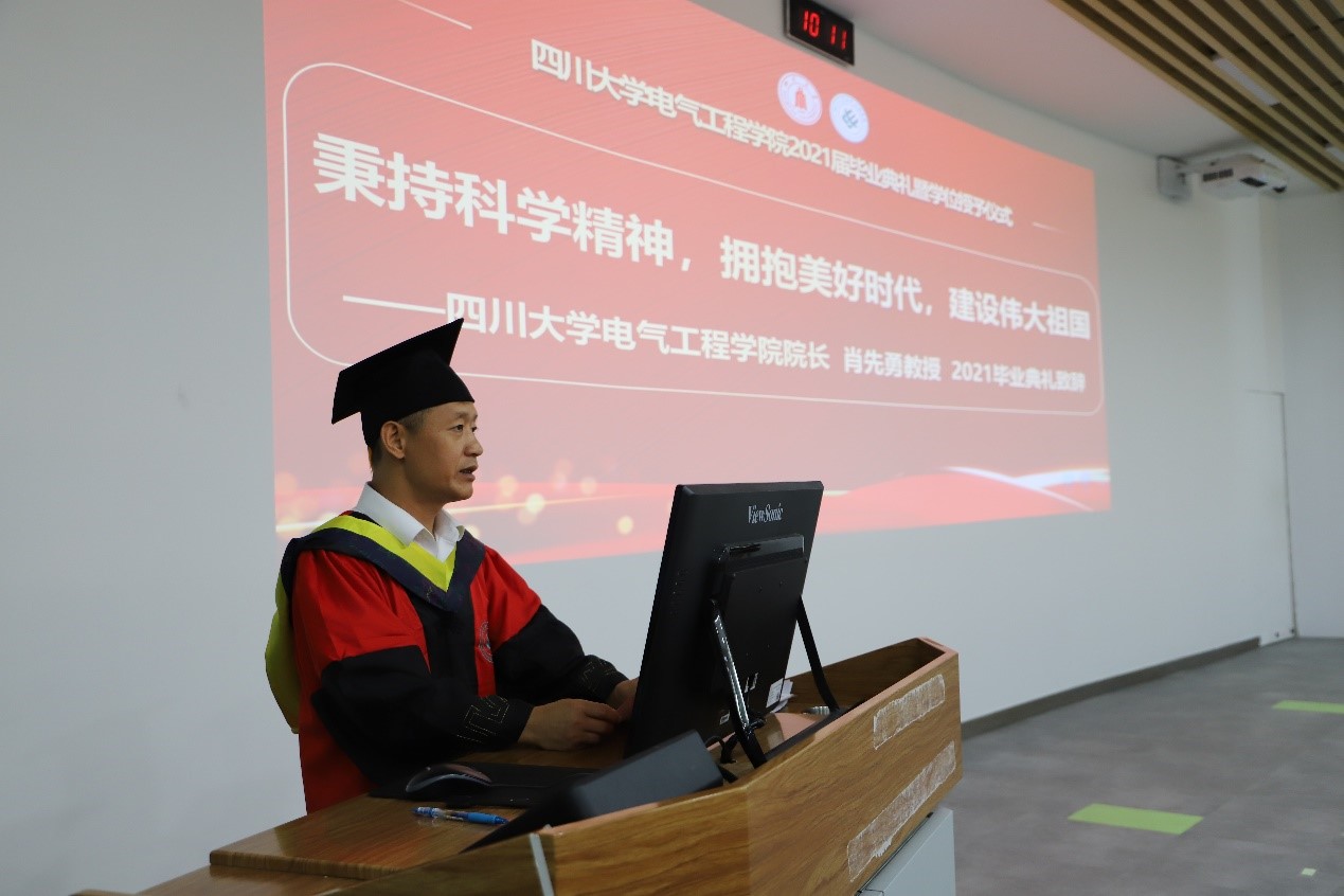 2021届学生毕业典礼暨授位仪式在望江校区基础教学楼C座201举行。在离别之际,学院院长肖先勇以“秉持科学精神,拥抱美好时代,建设伟大祖国”为题,向全体毕业生讲述了“最后一堂思政课”,向毕业生们分享了三点体会。