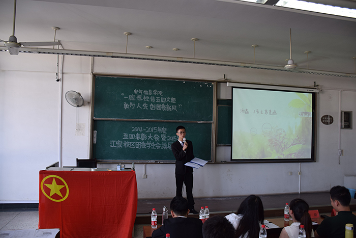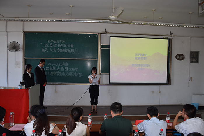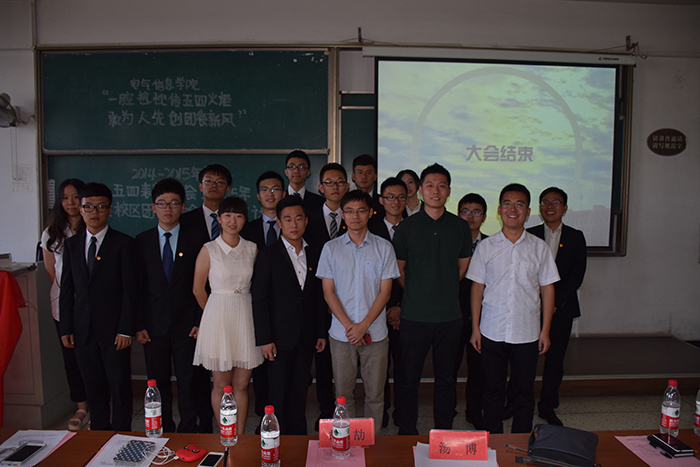 2015年5月29日下午4时电气信息学院2014-2015年度“一腔热忱传五四火炬,敢为人先创团委新风”“五四”表彰大会暨2015年江安校区团委学生会换届演讲于江安校区第一教学楼B座304教室成功举办。出席此次大会的嘉宾有:电气信息学院团委副书记汤博老师,电气信息学院2013级本科生辅导员胡劼老师,以及电气信息学院团委学生会主席团成员。