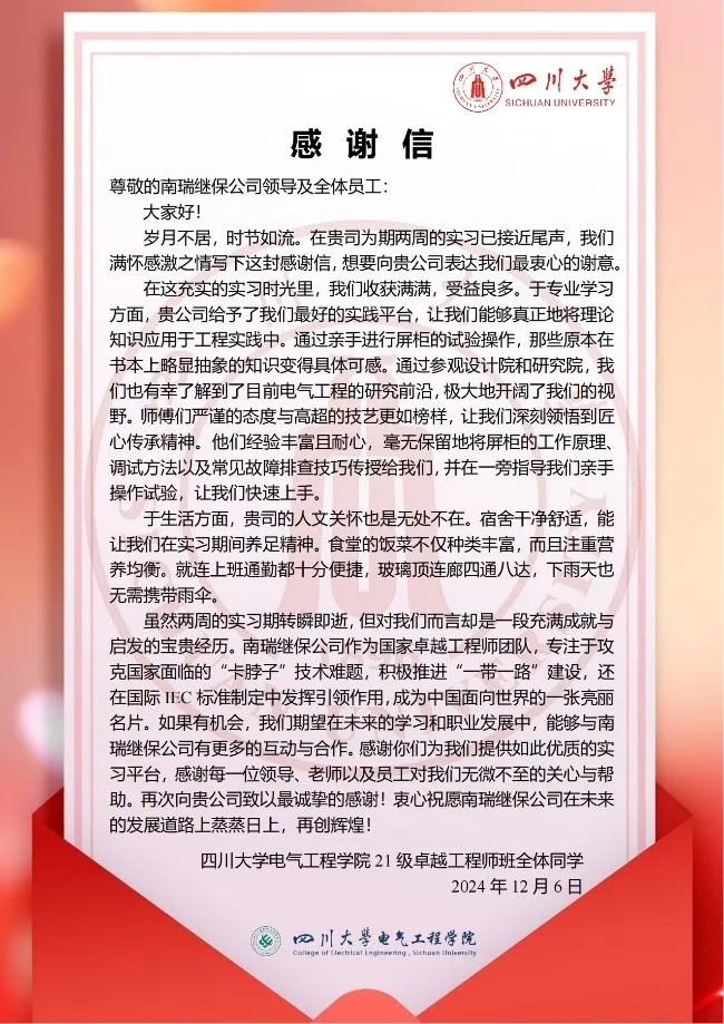 接着,同学们依次分享了两周的实习收获,纷纷表示在南瑞继保的实习中学到了重要的专业知识和生产技能,并对公司的良好企业氛围和师傅们认真的工作态度表达了赞赏和憧憬。此外,卓工班全体同学撰写了感谢信,由班长蒲雨馨代为朗读,表达了全体卓工班同学对南瑞继保公司领导及全体员工最衷心的谢意,期望在未来的学习和职业发展中能够继续与南瑞继保公司有更多的互动与合作。