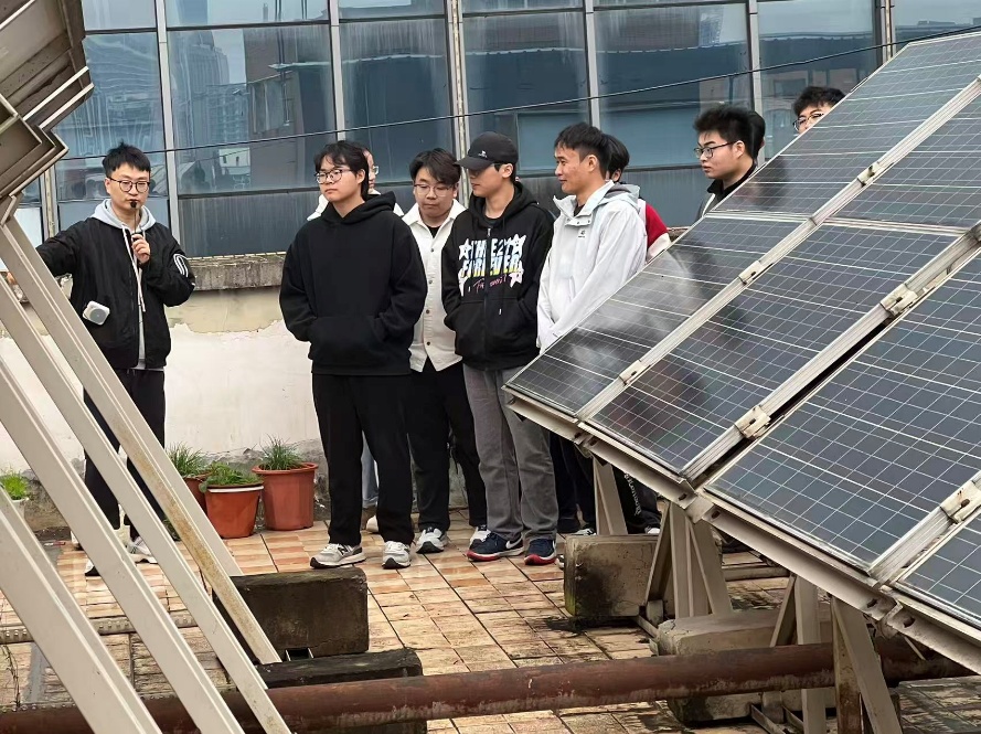 在光伏设备展示区,张芮老师结合现场组件与支架系统,为同学们讲解了光伏阵列接线、逆变并网技术及安全防护措施等内容。学生们积极提问,就组件清洗、遮挡效应及发电效率评估等问题与老师展开探讨,进一步掌握了光伏系统从发电到并网的完整工程流程。