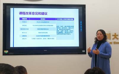 研讨活动首先由《专业发展趋势分析与英语文献检索阅读》课程组组长王渝红老师介绍了这门课程的改革情况。这门课程旨在帮助学生更深入地了解专业发展趋势,提高学生英语文献阅读能力,课程教学的关键在于“授人以渔”,通过分组讨论、课堂展示的方式让学生利用现代工具自行完成课程任务,学会自主学习专业知识。在思政教学环节,把社会主义核心价值观融入到课程的各个具体环节中,向学生传递爱国、诚信、友善等价值观念。