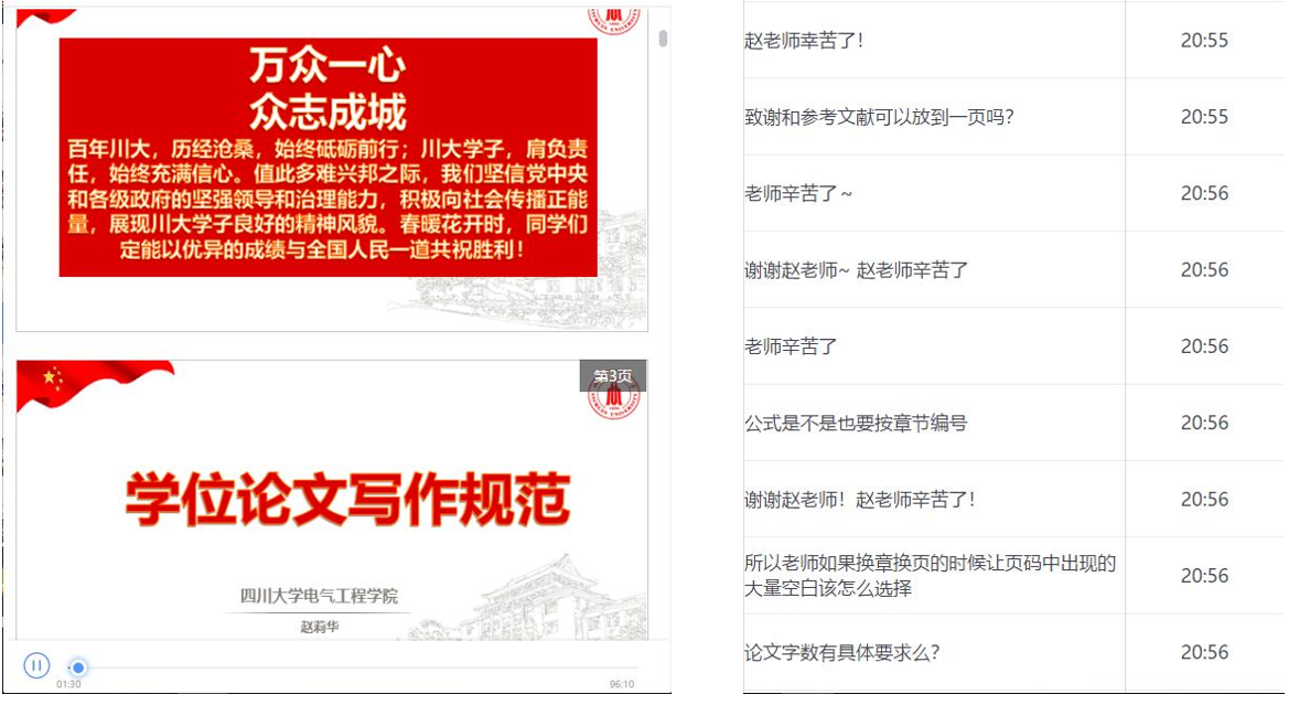 赵老师整个授课深入浅出,生动有趣,同学们也在听课期间积极反馈:在听讲解时,弹幕询问赵老师相关问题;当遇到自己也常犯的错误时,弹幕飞快地弹出“我也是这样”。赵老师与同学们通过弹幕有效而愉快地互动,授课效果颇佳,参与线上课堂的张同学表示:“宅在家里的我正为毕业论文的事发愁,赵老师真是雪中送炭,告诉了我不能踩的雷区在哪里,实在太棒了!”