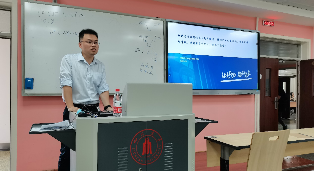 东方电机有限公司成立于1958年,是我国研究、设计、制造大型发电设备的重大装备制造骨干企业。讲座上,刘雄老师以在东方电机的就职经历以及在项目组的工程实践经验为基础,依次为同学们介绍了东方电机集团的企业历史、电机电器行业转型升级需求,以及在新型电力系统背景下智能机组升级方案的研究进展,还借助了一个具体案例帮助同学们理解相关内容在实际工程中如何运用。刘老师讲到,在新型电力系统的发展背景下,各企业都积极探索数字化转型方案,对此,东电提出了“研发设计数字化、产品智慧化、绿色智造、企业运营管理数字化、产品链协同数字化”五大转型方向,并通过数字化营销、制造、管理等八大数字化模块全面深化转型。最后,刘老师还介绍了项目组近期完成的几个重点项目及后续研究重点。