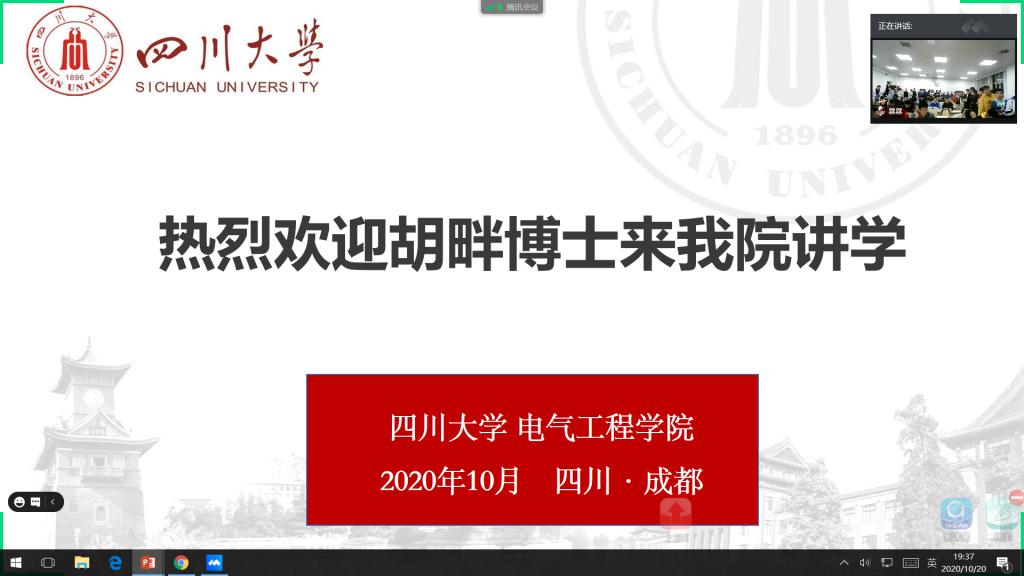 2020年研究生教改项目——高水平国际化项目立项。为了让课堂教学紧跟学术前沿,拓宽学生学术视野,丰富教育教学形式,10月20日晚上八点,国网湖北省电力有限公司电力科学研究院胡畔博士应邀进行授课,开展了题为“电压暂降及防治关键技术”的学术讲座。本次课堂以线上讲座+线下讨论的形式进行,学院众多硕博士研究生认真听取本次讲座,热烈讨论。本次讲座由汪颖老师主持。