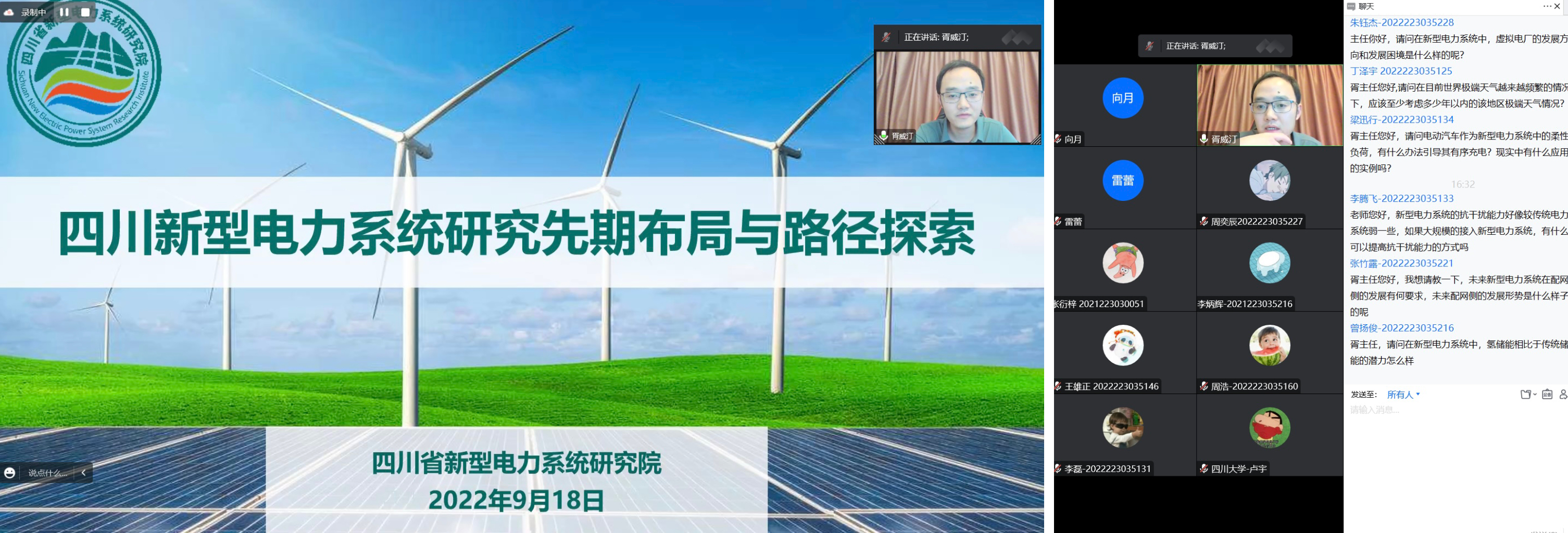 企业导师、四川新型电力系统研究院胥威汀主任作了题为“四川新型电力系统研究先期布局与路径探索”的精彩专题讲座。讲座从新型电力系统的形式与背景、特征与内涵以及四川省新型电力系统建设三个方面展开,清晰介绍了电气工程学科新型电力系统发展前沿与四川实际需求,吸引了学院“本-硕-博”300余师生在线参与学习与互动。同学们将自己的疑惑和见解主动与胥主任展开交流与讨论,他表示同学们所提问题都很专业、很有水平,大家也表示通过此次讲座收获满满。