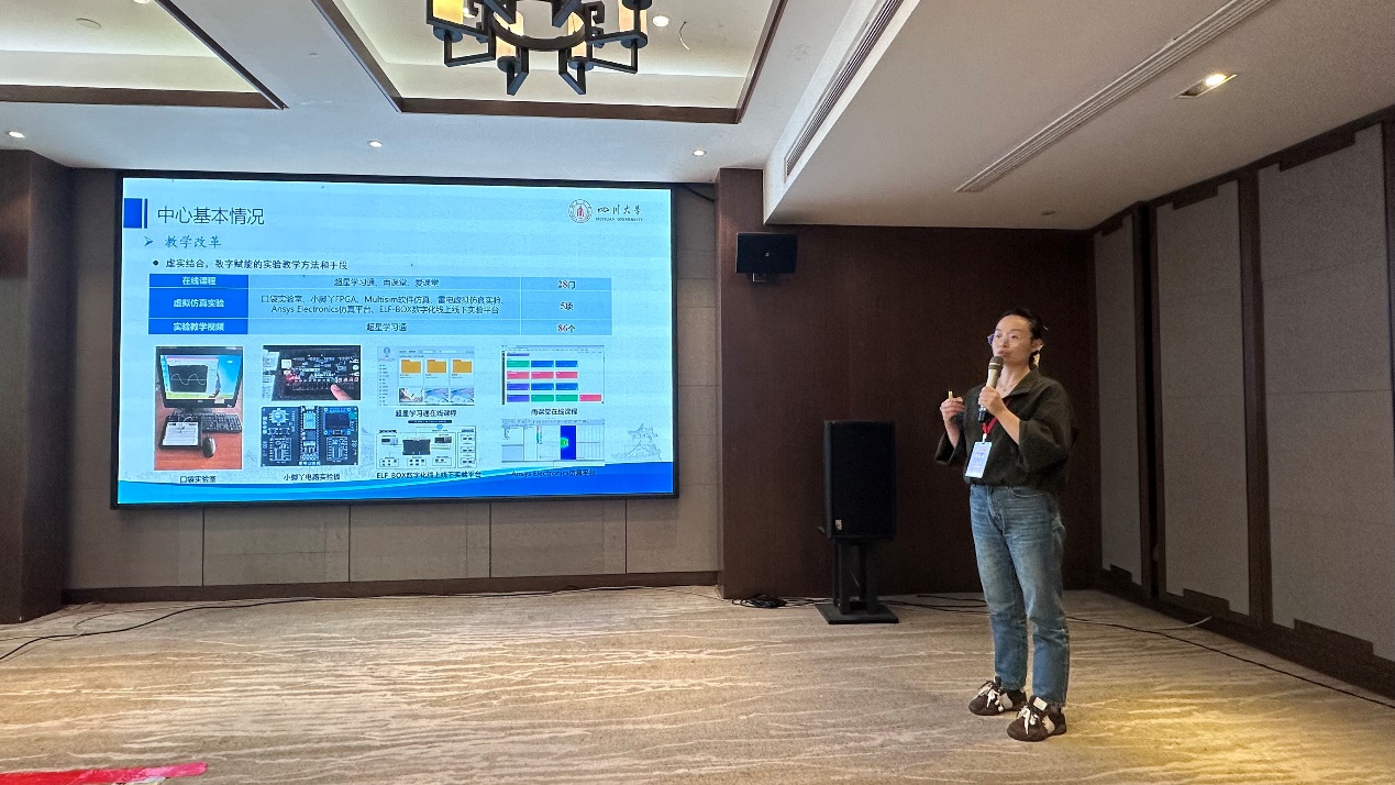 在分会场报告中,来自上海交通大学殳国华教授、厦门大学李继芳教授、东北大学肖军教授等多位教师代表分享了契合工程实际需求的实验课程教学体系建设经验。中心教师印月以“AI赋能电子技术实验课程数字化建设实践”为题作专题报告,分享了学院电工电子中心近年来在实验课程数字化建设中的创新实践,深入阐述了中心构建的数字化实践教学体系。并与参会教师围绕图谱构建、数据管理等问题展开深入交流。