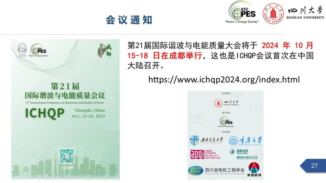 高端外籍教师,每年在川大工作3月)为团队学术带头人。近几年,团队承担国家重点研发计划、国家自然科学基金(重点、面上、青年)、省部级和国网、南网等项目60多项,年科研经费2000多万元,发表SCI论文120余篇,授权专利62项,编制国际标准、国家标准、行业标准共12项。获省部级奖9项,其中四川、江苏省科技进步奖一等奖各1次,中国电力创新奖一等奖1次,中国专利奖优秀奖1次。成果应用在全国21个省级电网,包括北京冬奥会、成都世乒赛、成都大运会等重大活动,西电东送、清洁能源消纳、卫星发射等国家重大工程。获电能质量领域最有影响力的IEEE ICHQP 2024年主办权,该会议首次在中国大陆举办。