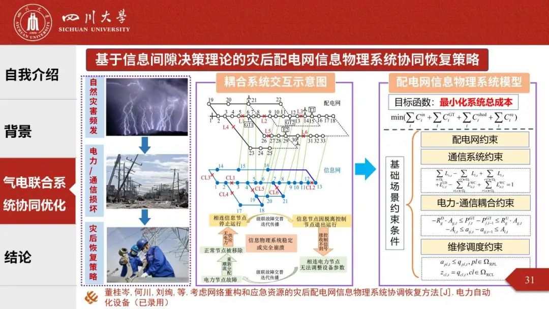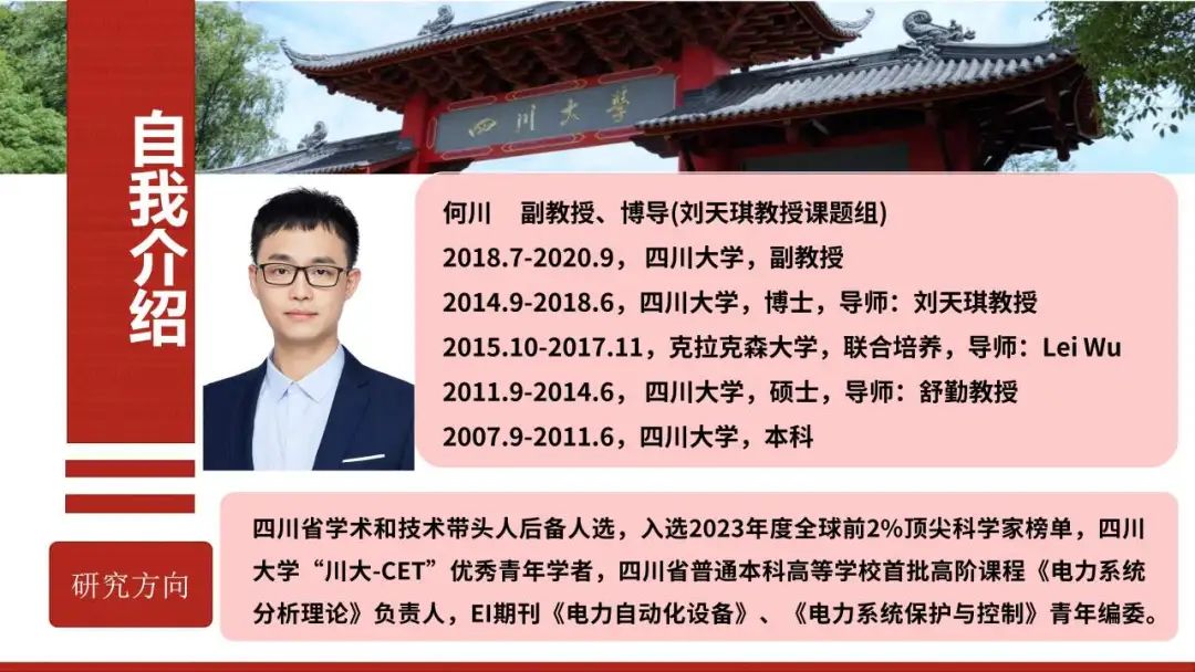 何川副教授:博士生导师,四川省学术和技术带头人后备人选,入选2023年度全球前2%顶尖科学家榜单,a漫 “川大-CET”优秀青年学者”,四川省普通本科高等学校首批高阶课程《电力系统分析理论》负责人,EI期刊《电力自动化设备》、《电力系统保护与控制》青年编委,期刊《宁夏电力》编委。长期从事电力系统与气电联合系统设计规划和优化运行相关的研究工作,总计发表论文60余篇,其中以第一作者/通讯作者身份发表21篇SCI论文、16篇EI论文, H因子为14,在Web of Science中被他引1052次,1篇ESI高被引论文。主持国家自然科学基金青年项目1项、面上项目1项,省部级项目3项。