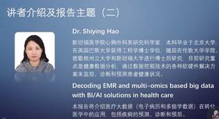 讲座邀请来自清华大学的助理教授眭亚楠博士和斯坦福医学院的Shiying Hao博士作为分享嘉宾。眭亚楠博士本科毕业于清华大学,博士毕业于加州理工学院,曾在加州理工学院Joel Burdick/Yisong Yue教授课题组和斯坦福大学Fei-Fei Li教授课题组从事博士后研究,研究领域主要为医学人工智能、机器学习、神经工程和机器人技术。眭博士在讲座中介绍了医疗智能化研究的所需技术和最新应用,包括有安全保证和高效利用多种反馈的强化学习理论与算法,及其在机器人学(火星探测器控制)和临床医学(神经调控疗法)等领域的应用。Shiying Hao博士本科毕业于北京大学,博士毕业于英国巴斯大学,曾在伦敦大学学院(UCL)、密歇根州立大学和斯坦福大学从事了五年的博士后研究,研究领域主要为健康数据分析。Shiying Hao博士在讲座中介绍了国际上流行的医疗健康的智能技术发展和应用前景,包括医疗大数据(电子病历和多组学数据)在转化医学中的应用,以及疾病的预测、诊断和预后。两位嘉宾的精彩分享引起了听众的广泛兴趣,受到一致好评。