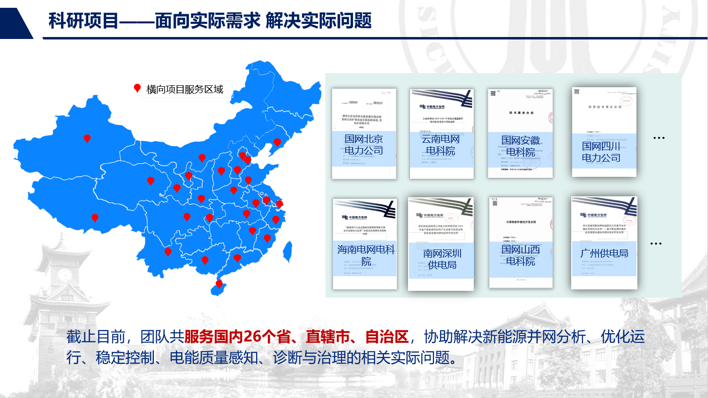 高端外籍教师,每年在川大工作3月)为团队学术带头人。近几年,团队承担国家重点研发计划、国家自然科学基金(重点、面上、青年)、省部级和国网、南网等项目60多项,年科研经费2000多万元,发表SCI论文120余篇,授权专利62项,编制国际标准、国家标准、行业标准共12项。获省部级奖9项,其中四川、江苏省科技进步奖一等奖各1次,中国电力创新奖一等奖1次,中国专利奖优秀奖1次。成果应用在全国21个省级电网,包括北京冬奥会、成都世乒赛、成都大运会等重大活动,西电东送、清洁能源消纳、卫星发射等国家重大工程。获电能质量领域最有影响力的IEEE ICHQP 2024年主办权,该会议首次在中国大陆举办。团队被IEEE Fellow、电能质量国际知名学者Math Bollen评价为“leading group”。