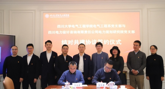 电气工程系党支部与四川电力设计咨询有限责任公司电力规划研究院党支部在望江校区签订结对共建协议。四川电力设计咨询有限责任公司副总经理卓越,电力规划研究院党支部书记莫骏,电力规划研究院党支部副书记钟继友,青年委员唐浩等参加签约仪式。学院党委书记赵昱辉,党委副书记张英敏、副院长周步祥,电气工程系党支部书记陈实,电气工程系党支部副书记刘亚梅、支部委员许立雄、张姝参加相关活动。