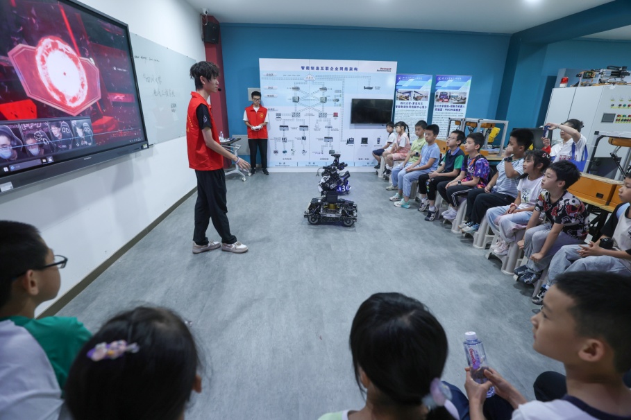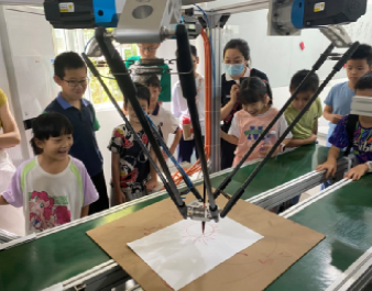 工业机器臂娴熟的绘画技艺,受到小朋友们的欢迎;大学生哥哥们自主组装的机甲战车互动,更是让小朋友们爱不释手。