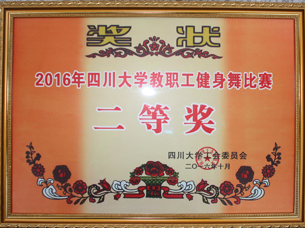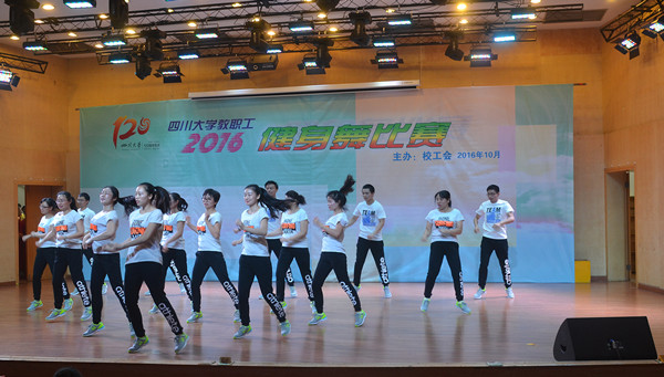 2016年教职工健身舞比赛在望江校区文华活动中心二楼音乐厅举行,电气信息学院健身操代表队喜获二等奖。比赛中,a漫