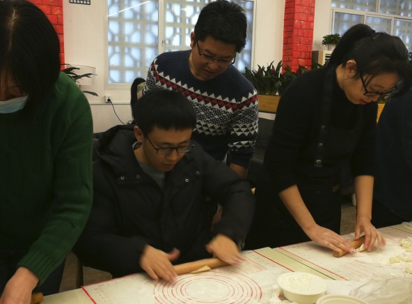 在一片忙碌中,到了包饺子的重要环节,老师们都卷起了袖子,拿起了擀面杖。无论是刚毕业鲜少下厨的老师,还是游刃有余经验丰富的老师,大家都热热闹闹地动起来。大家一边动手包饺子,一边讨论着包饺子的技巧,不一会儿几百个形状各异的饺子就出炉了。最后,老师们在一片欢声笑语中品尝自己的劳动成果,在轻松的生活氛围中系上老师们之间的情谊也得到了增进。