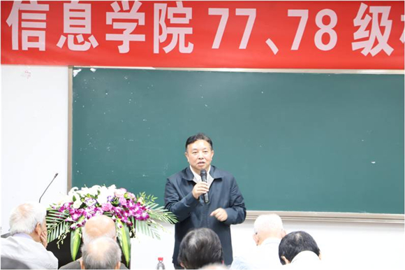 接下来,王贵德、尤克伟、蒋润书、张邦亮、黄家英、敬东6位老教师代表依次上台发言。忆起当年与77、78级同学们共同经历的岁月,老师们都感慨万分:77、78级同学作为恢复高考后的第一批学生,每一位同学都无比珍惜学习的机会。看到昔日的学生荣归母校,老师们的言语中都有掩不住的欣慰。他们不忘初心,退休多年仍一如既往地关心学院的科研及人才培养事业,鼓励校友们为学院人才培养贡献力量。