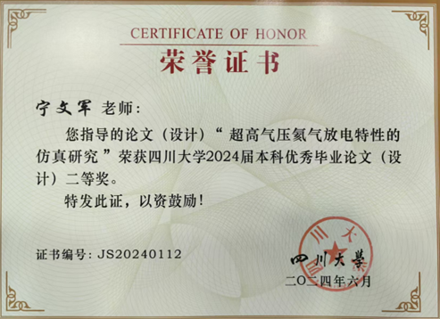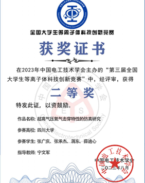 2024 第四届全国大学生等离子体科技创新竞赛,二等奖(杨淮,2022级本科)