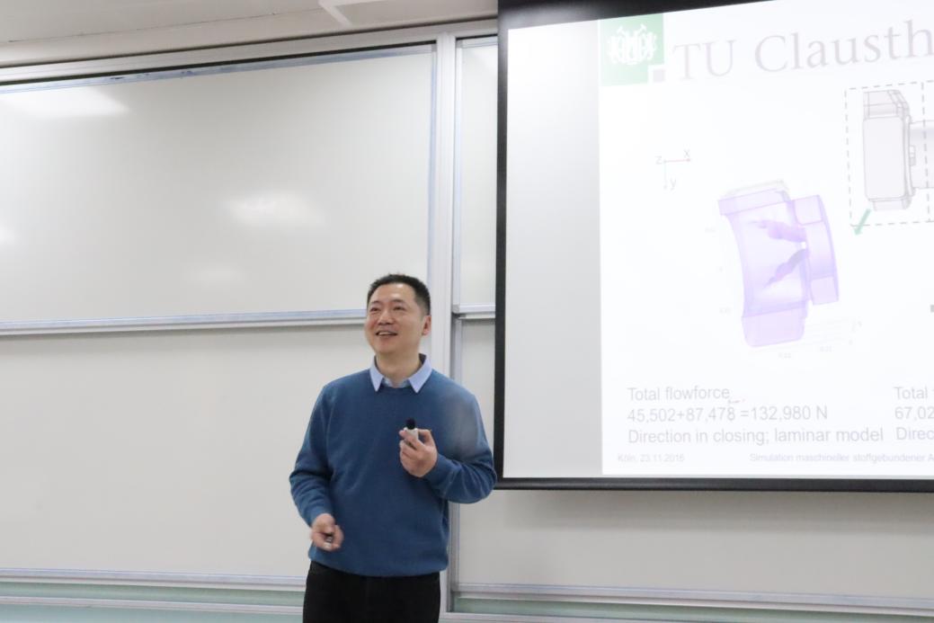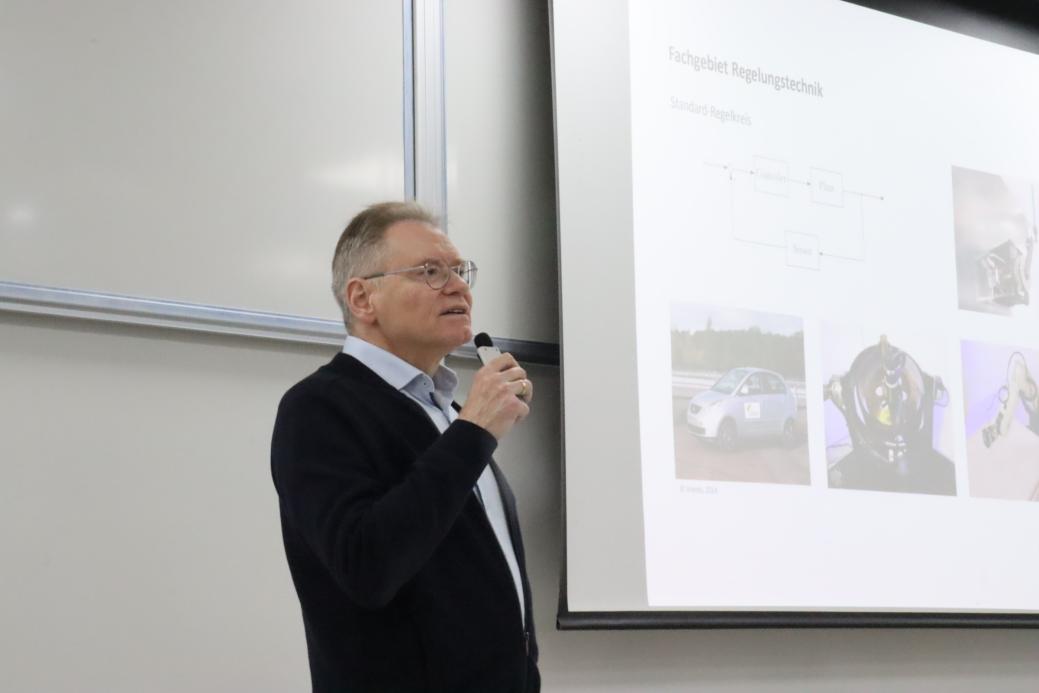会上,Herbert Werner老师首先发言,全程以德语传递专业见解。他详细介绍了自己的教育背景与科研经历,分享了在汉堡工业大学任教期间主攻的科研方向,以及在相关研究中取得的丰硕成果。他鼓励同学们要勇敢探索,在学习过程中选择自己真正热爱的方向深入钻研,不断挖掘自身潜力。