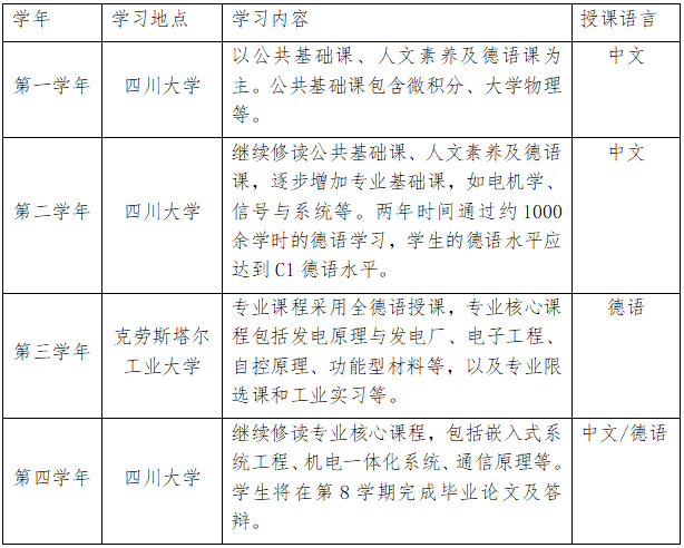 是教育部直属全国重点大学,是国家布局在中国西部的重点建设的高水平研究型综合大学。川大电气工程及其自动化专业是我国第一批创办的电气工程专业。专业入选国家级“卓越工程师教育培养计划”,通过工程教育专业认证,并获批国家级一流本科专业建设点,拥有智能电网四川省重点实验室、电能质量及电磁环境学省级重点实验室、信息与自动化技术省级重点实验室等教学科研单位。德国拥有世界知名的大学工程教育,克劳斯塔尔工业大学是中国教育部认可的德国知名公立研究型工业大学,是德国国际化程度最高的大学之一,与约200所国际教育、研究机构建立了合作伙伴关系。其国际化的课堂及研讨会是一大特色,对学生个人的指导、教学与实践的结合度以及与工业界的相关性是教学的亮点,相关指标在德国大学的排名中名列前茅。