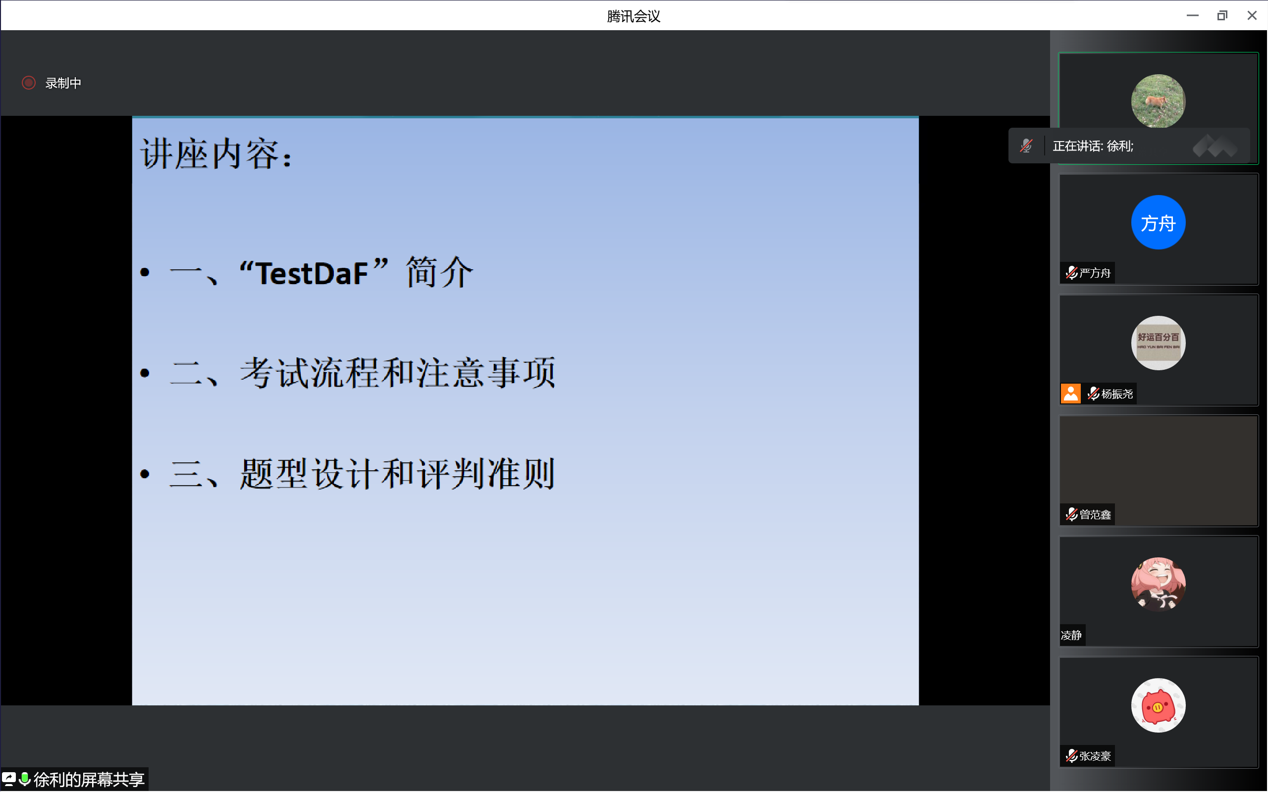 12月2日,“TestDaF考试备考指南”主题沙龙于线上顺利举行。本次活动邀请了四川外国语大学副教授、原TestDaF考试西南地区考点主考官徐利与2021级和2022级中德班同学线上交流,分享关于备考TestDaF的注意事项。