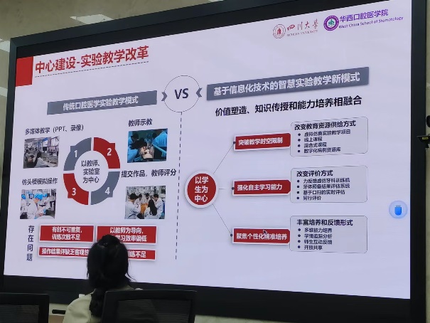 交流会上,华西口腔医学院教学实验室主任郑庆华副教授对实验教学中心建设现状进行了介绍,并提出了“学科引领,信息赋能”的中心发展思考。岳莉、游梦和谢蟪旭老师分别从数字化赋能、数字图像教学资源平台建设和虚拟仿真项目建设应用等方面分享了实验教学示范中心的宝贵建设经验。