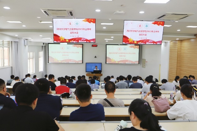 在基础教学楼召开2023年上半年全院干部教职工大会。学院全体领导班子成员、全体教职工参加会议。会议旨在深入学习贯彻党的二十大精神,扎实推进主题教育,总结学院上半年工作成绩,部署学院下一阶段工作,动员全院教职工攻坚克难重成效,自强不息开新篇,加快推动学院高质量内涵式发展再上新台阶。会议由学院副院长李成鑫主持。