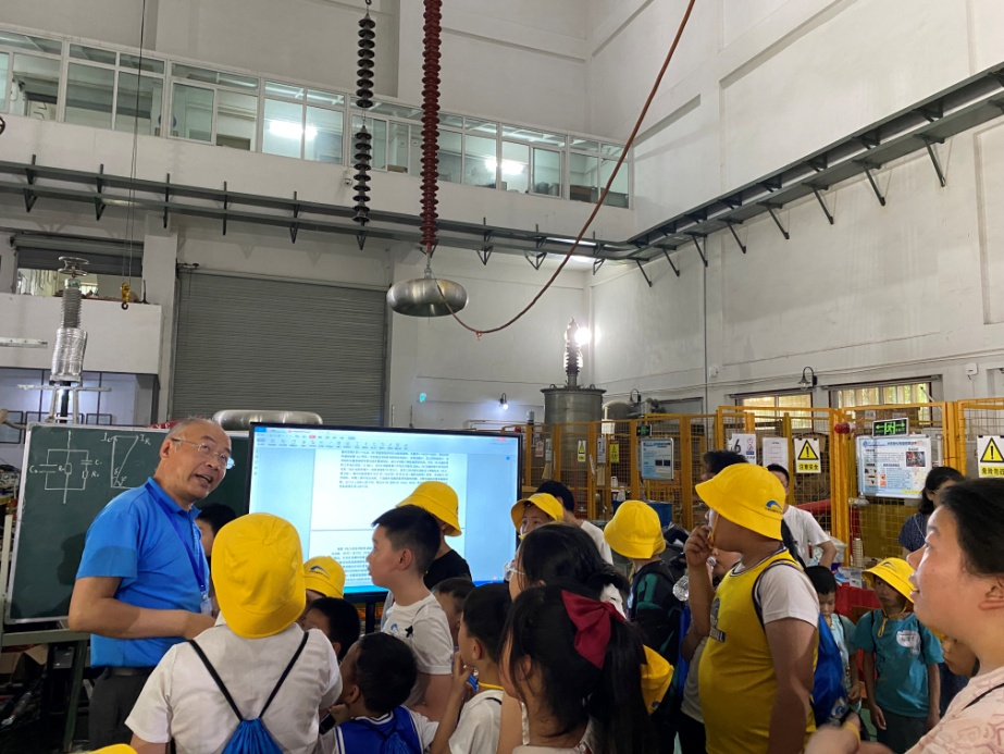 在高电压实验室,同学们第一次见到雄伟高大的高电压设备,开拓了视野;聚精会神地听老师的讲解和演示,学习到了很多电力相关知识,了解了室内外用电安全的措施及原因。
